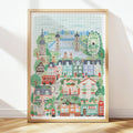 En esta ilustración captura Londres en todo su esplendor: las icónicas cabinas telefónicas y autobuses rojos, el Big Ben, la noria London Eye, el London Bridge y las casas típicas de la capital inglesa. Una composición rica en detalles y matices que invita a perderse en cada rincón.