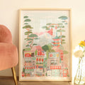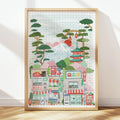 En esta ilustración nos presenta Tokio en todo su esplendor: tiendas y restaurantes llenos de luz, rótulos luminosos característicos de la ciudad, el Monte Fuji al fondo, un templo tradicional y los icónicos cerezos en flor. Una composición rica en color y detalles que invita a perderse en cada rincón.